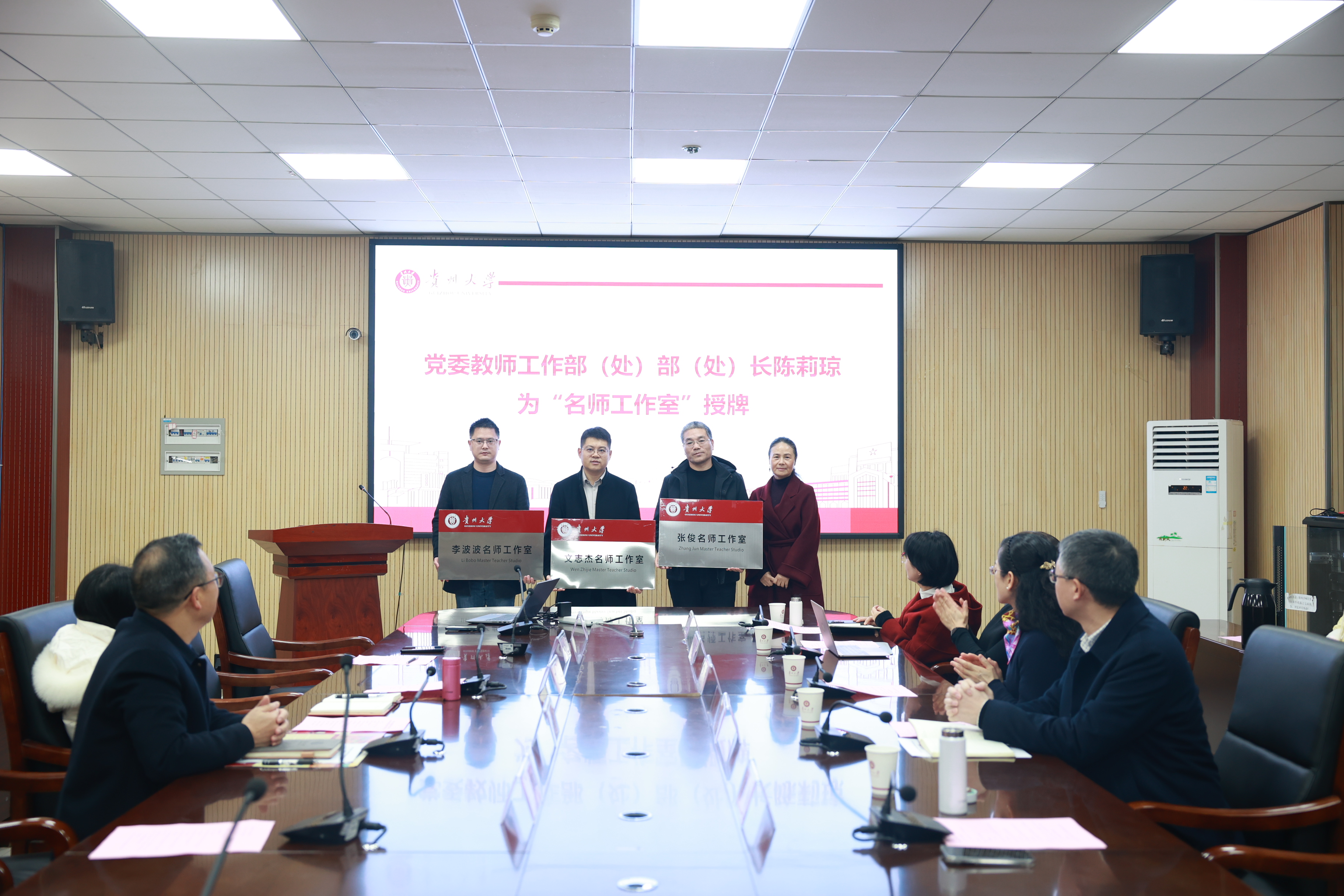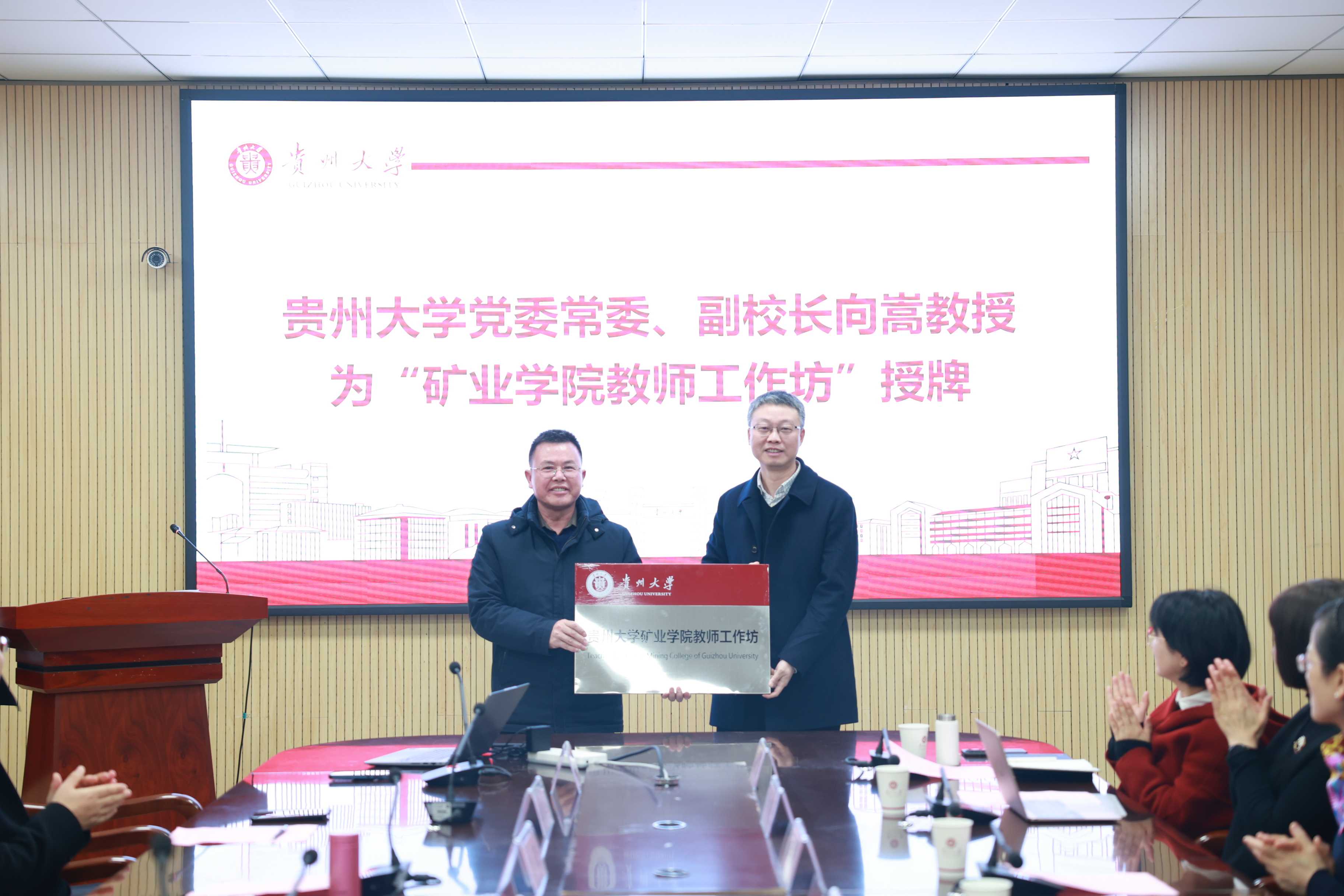 在授牌阶段,副校长向嵩教授为矿业学院授牌“贵州大学矿业学院教师工作坊”,党委教师工作部陈莉琼部长为矿业学院授牌“文志杰名师工作室”“李波波名师工作室”和“张俊名师工作室”。
